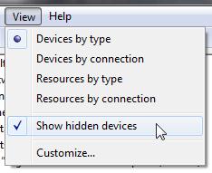 devmgmt.msccommand; - Select View->Show Hidden Devices in the menu;