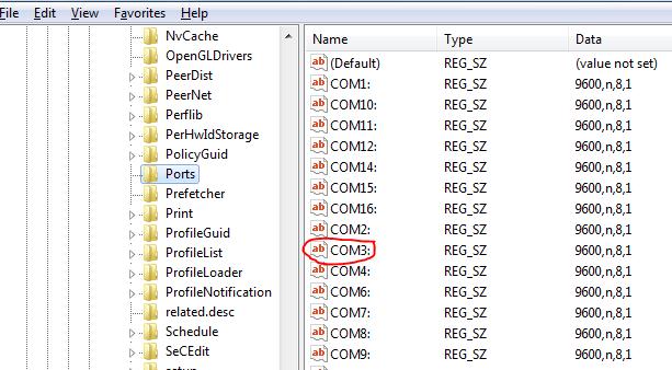 - The HKEY_LOCAL_MACHINE\SOFTWARE\Microsoft\Windows NT\CurrentVersion\Ports registry key contains the list of all assigned COM port numbers. You can remove all unnecessary port reservations. In our example, we’ll leave only COM3 and delete the rest ports;