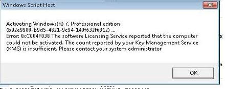 0xc004f038: The Software Licensing Service reported that the computer could not be activated. The count reported by your Key Management Service (KMS) is insufficient. Please contact your system administrator.
