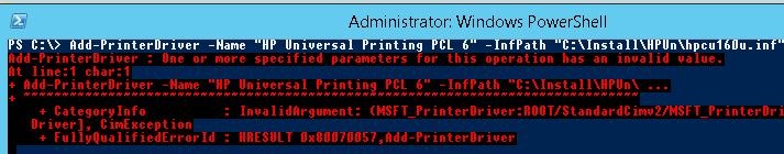 Add-PrinterDriver : One or more specified parameters for this operation has an invalid value.At line:1 char:1+ Add-PrinterDriver -Name “HP Universal Printing PCL 6” -InfPath “C:\Di …+ ~~~~~~~~~~~~~~~~~~~~~~~~~+ CategoryInfo : InvalidArgument: (MSFT_PrinterDriver:ROOT/StandardCimv2/MSFT_PrinterDriver) [Add-PrinterDriver], CimException + FullyQualifiedErrorId : HRESULT 0x80070057,Add-PrinterDriver