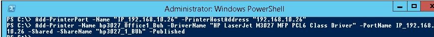 Add-Printer -Name hp3027_Office1_Buh -DriverName "HP LaserJet M3027 MFP PCL6 Class Driver" -PortName IP_192.168.10.26 -Shared -ShareName "hp3027_1_BUh" –Published