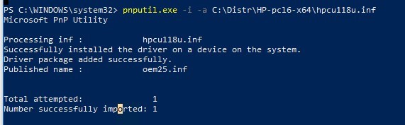 pnputil.exe -i -a C:\Distr\HP-pcl6-x64\hpcu118u.inf(installs the specific printer driver) orpnputil.exe -i -a C:\Distr\HP-pcl6-x64\*.inf(installs all the drivers found in the INF files in the specified directory); - the cmdlet Add-WindowsDriver that allows to integrate drivers into the offline Windows image.
