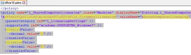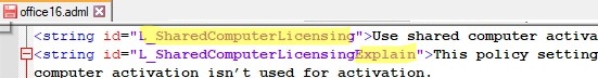 For example, Office 365 ProPlus (Microsoft 365 Apps) has a special mode for installing on an RDS server called Office Shared Activation. In this mode, you can use one copy of Microsoft 365 Apps for simultaneous work of several users (for activation, users must sign in under their accounts to which the Microsoft 365 subscription is linked, i.e. using online subscription activation instead of Office KMS activation). In order to use this mode, you need to enable the Use shared computer activation Group Policy setting from the Computer Configuration -> Administrative Templates -> Microsoft Office 2016 (Computer) –> License Settings section. The settings for this GPO option are in office16.admx file. Open this file using your favorite text editor.