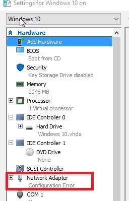 - Check the network adapter settings of the VM. Virtual network adapters must be connected to an existing Hyper-V virtual switch (there must be no status Network Adapter – Configuration Error for any NIC);