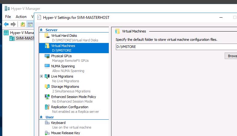 You can get the VM GUID using the Hyper-V Manager console. Open the Hyper-V server settings. The Server section contains the directory where the VM configuration files are stored (in our case it is D:\VMStore).