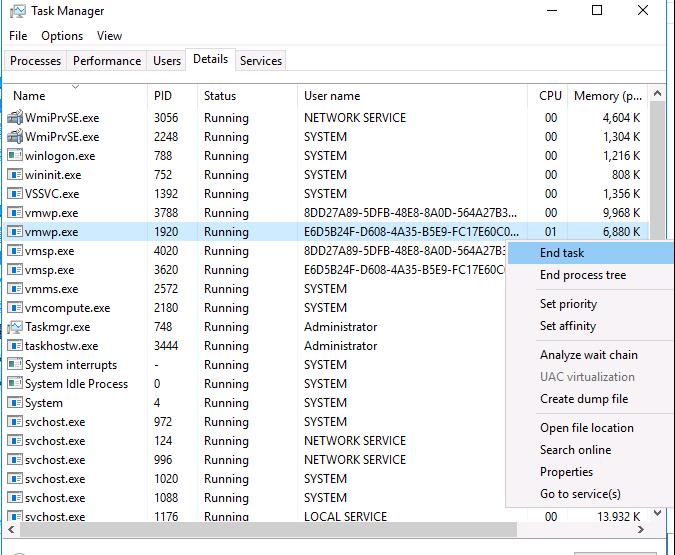 Run the Task Manager and go to the Details tab. All virtual machines are running under their own instance of vmwp.exe process. To determine which process is responsible for your VM, you need the GUID of the hung-up VM you obtained earlier. Find the process vmwp.exe that has the GUID of your VM in the User name column. Kill this VM process (End Task).