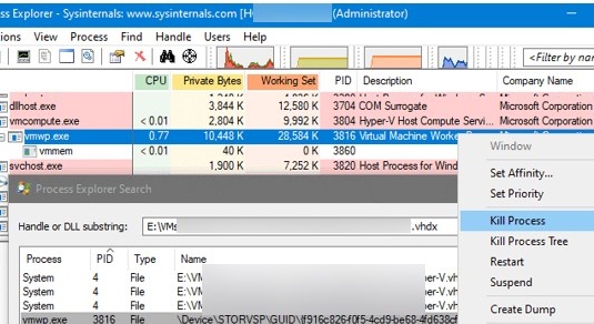 - Process Explorer will list all processes that are using the virtual machine VHDX file;