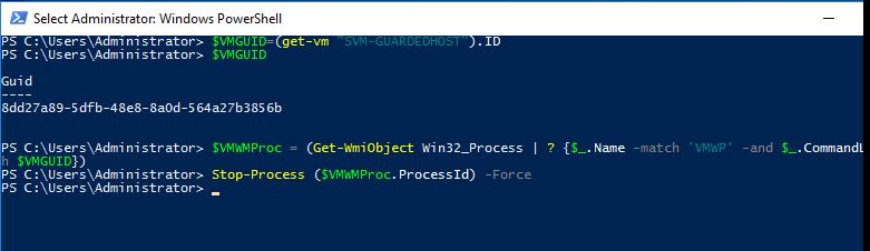 Stop-VM -Forcecommand, it also hangs. Obviously waiting for a response from the VM.You need to kill a VM process by its GUID. You can get the VM GUID by its name. For example, to get the GUID of the VM with the name SVM-GUARDEDHOST1, run the command: