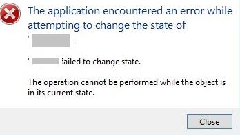 The application encountered an error while attempting to change the state of VM. Failed to change state. The operation cannot be performed while the object is in its current state.