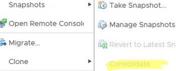 To fix the error ‘Virtual machine Consolidation Needed’, right-click on the virtual machine and select VM -> Actions -> Snapshots -> Consolidate.
