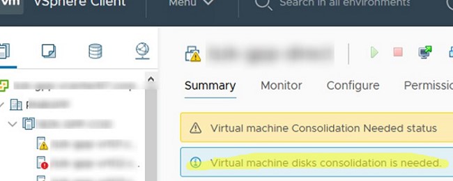 Virtual machine Consolidation Needed status. Virtual Machine disks consolidation is needed.