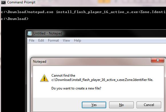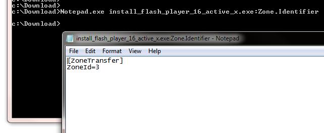 As we can see, the alternative stream Zone.Identifier has been assigned to the executable files, like install_flash_player_16_active_x.exe:Zone.Identifier.