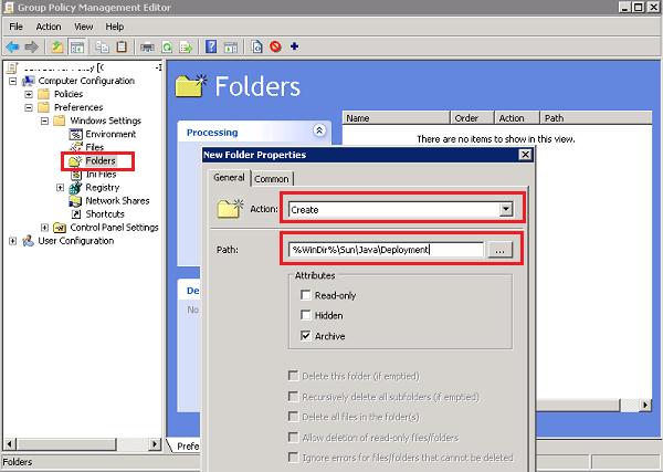 Using GPP (Group Policy Preferences), we have to create a folder to store configuration files with Java settings on user computers. To do it, create a new item in GPO Computer Configuration –> Preferences –> Windows Settings –> Folders with the following settings: