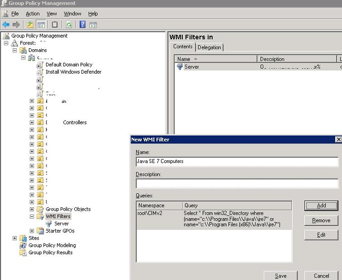 To do it, open the Group Policy Management Console and create a new WMI filter with the name Java SE 7 Computers in WMI filters section. In the description field, write something like “For Policies that will only apply for hosts running Java SE 7″ and use the following WMI WQL query:
