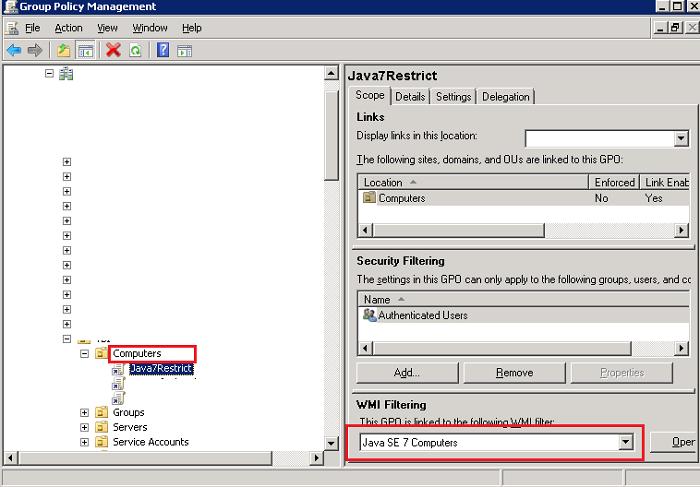 Now you only have to select Java SE 7 Computers we have created earlier as the WMI filter and link (assign) a policy to the corresponding AD container (OU).
