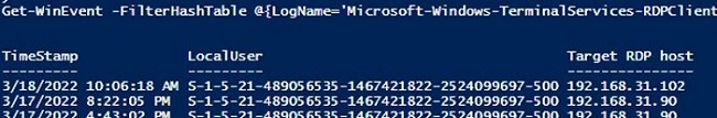 The script returns the SIDs of the users who initiated RDP connections on this computer, as well as the DNS names/IP addresses of the Remote Desktop hosts that the users connected to. You can convert SIDs to usernames as follows.