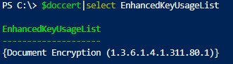 The command will return the Thumbprint, Subject, and EnhancedKeyUsageList of the new certificate. By default, such a certificate can be used for Client Authentication (1.3.6.1.5.5.7.3.2) or Server Authentication (1.3.6.1.5.5.7.3.1).