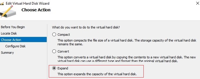 - In the appearing Edit Virtual Hard Disk wizard choose Expand;