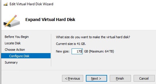 - Specify the new size of the virtual hard disk (in our example we’ll expand the disk size to 170 GB);