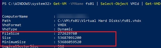 These cmdlets also returns the actual size of the VHDX file on the storage (FileSize) and the maximum size that it can take (Size). MinimumSize is the minimum VHDX disk size to which a virtual disk file can be reduced.