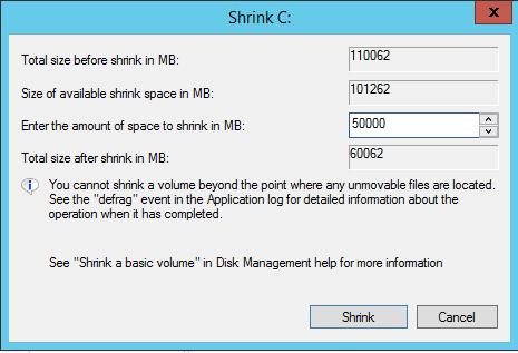 - Specify the amount of space to shrink the partition by (in our example we specified 50GB);