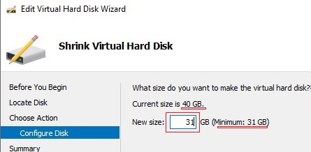 - In the Edit Virtual Hard Disk wizard, select Shrink, then specify a new size for the vhdx file. Please note that you cannot make the disk smaller than the data on it (check the Minimum value). In our case, you can reduce the disk size from 40 to 31 GB;