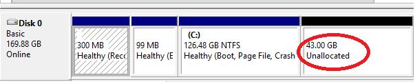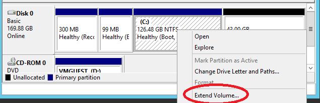 - Go to the console of the guest OS, which disk was extended. Let’s take a look at how to increase a system partition in a Windows guest OS. Open the Disk Manager console. As you can see, extra 43 GB of unallocated space appeared on the disk;