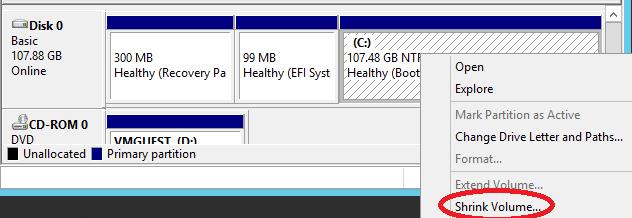- Before shrinking a virtual disk from the Hyper-V console, it is necessary to reduce the size of the logical partition on the disk inside the guest OS. Free up some space and convert it to the unallocated volume. To do it, open the Disk Manager in the guest OS, select a volume and click Shrink Volume;Note. Shrink Volume option becomes available only if there is some free space on the partition.