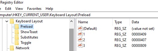 HKEY_CURRENT_USER\Keyboard Layout\Preloadregistry key. For example, 0000409 – English layout, 00000407 – German layout, 00000410 – Italian, etc.; (check the list of Default Input Profiles/Input Locales in Windows: https://docs.microsoft.com/en-us/windows-hardware/manufacture/desktop/default-input-locales-for-windows-language-packs?view=windows-11 ); - Remove all unused language layouts from the registry if necessary, and change the numbering of the registry parameters (the parameter names should be consecutive and start from 1).