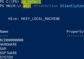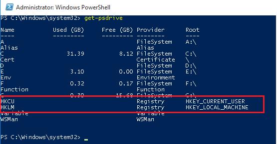 Note that among the drives (with drive letters assigned) there are special devices available through the Registry provider – HKCU (HKEY_CURRENT_USER) and HKLM (HKEY_LOCAL_MACHINE). You can browse the registry tree the same way you navigate your drives. HKLM:\ and HKCU:\ are used to access a specific registry hive.