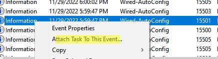 Click on event 15501 in the Event Viewer and select Attach task to this event.