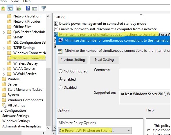 You can also disable the use of Wi-Fi if there is an active Ethernet connection to the domain LAN. You can configure this behavior using the GPO option Minimize the number of simultaneous connections to the Internet or a Windows Domain under Computer Configuration -> Administrative Templates -> Network -> Windows Connection Manager. Enable the policy and select 3=Prevent Wi-Fi when on Ethernet.