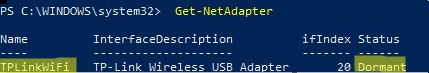 Now try to connect the LAN cable. After a couple of seconds, your Wi-Fi adapter will be automatically disabled (Status=Dormant).