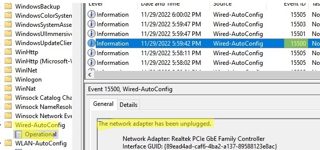 Now open the Event Viewer (eventvwr.msc) and go to Applications and Services Logs -> Windows -> Wired-AutoConfig -> Operational. Here we are interested in two following events: