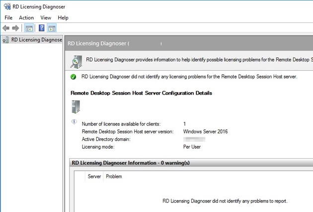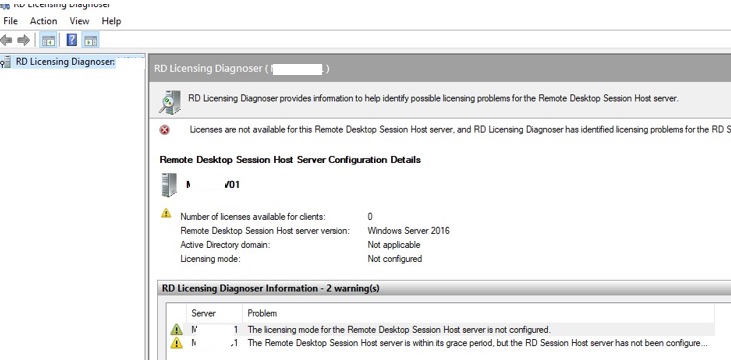 lsdiag.mscor Administrative Tools -> Remote Desktop Services -> RD Licensing Diagnoser). RD Licensing Diagnoster can be installed on RDSH servers using Server Manager (Features -> Remote Server Administration Tools -> Role Administration Tools -> Remote Desktop Services Tools -> Remote Desktop Licensing Diagnoser Tools).If the RDSH server is not configured to use an RDS license server, the following warnings will appear in the Licensing Diagnoser console: