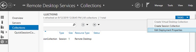 To change the name/address of the licensing server on the RDS host, open Server Manager -> Remote Desktop Services -> Collections. In the upper right menu “Tasks” select “Edit Deployment Properties”.