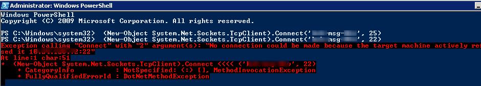 (New-Object System.Net.Sockets.TcpClient).Connect('ny-msg01', 25)