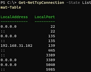 Get-NetTcpConnection -State Listen | Select-Object LocalAddress,LocalPort| Sort-Object -Property LocalPort | Format-Table