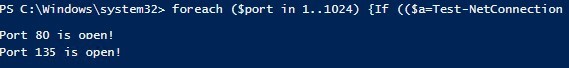 foreach ($port in 1..1024) {If (($a=Test-NetConnection srvfs01 -Port $port -WarningAction SilentlyContinue).tcpTestSucceeded -eq $true){ "TCP port $port is open!"}}