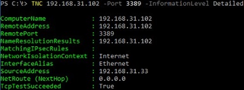 TNC 192.168.32.101 -Port 3389 -InformationLevel Detailed