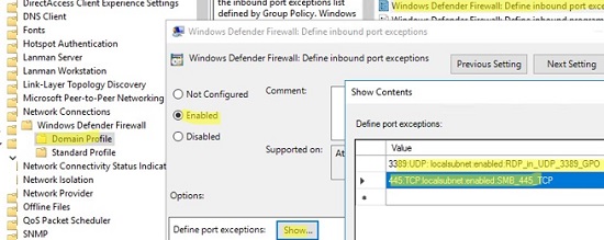 Below is the list of inbound firewall rules that I want to add to the Group Policy: