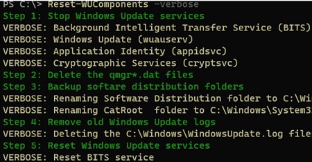 The Reset-WUComponents command stops services, re-registers DLLs, and cleans up the C:\Windows\SoftwareDistribution folder, etc. The full log of actions is available.
