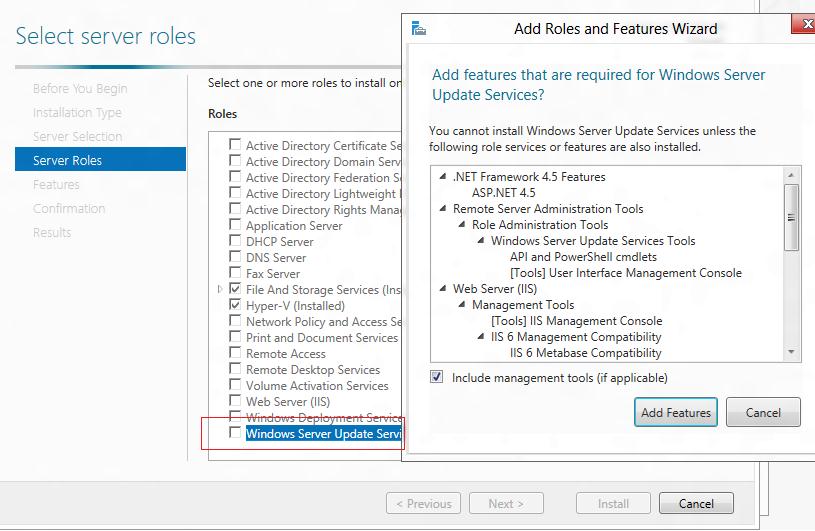 To install WSUS, open the Server Manager console and check the Windows Server Update Services role (the system will automatically select and offer to install the necessary IIS web server components).
