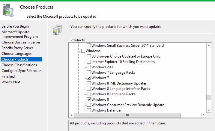 Then specify the list of products for which the WSUS should download updates. Select only those Microsoft products that are used in your environment. For example, if you are sure that there are no Windows 7 or Windows 8 computers left on your network, don’t select these options. This will significantly save space on the WSUS server drive.