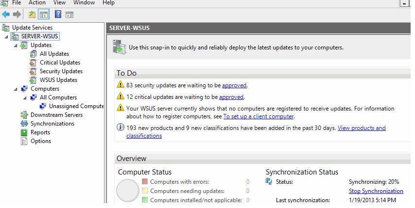 The initial synchronization of the WSUS server with the upstream update server may take up to several days, depending on the number of products you chose earlier and your ISP.
