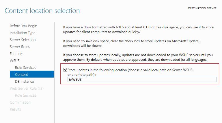 If you want to store update files locally on the WSUS server, enable the option Store updates in the following locations and specify the directory path. This can be a folder on a local disk (a separate physical or logical volume is recommended), or a network location (UNC path). Updates are downloaded to the specified directory only after they have been approved by the WSUS administrator.