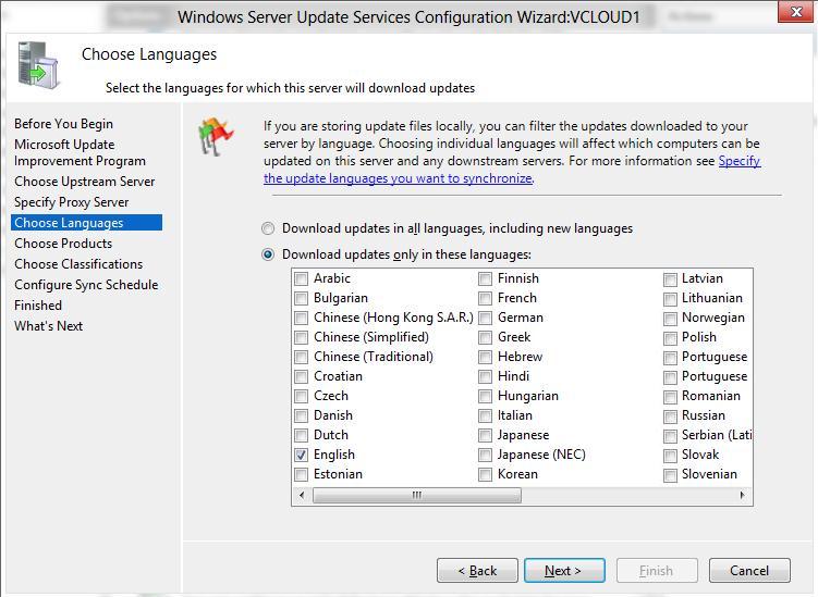 Then you need to select the product languages for which WSUS will download updates. We select English (the list of the languages can further be changed from the WSUS console).