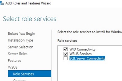 In the next window, choose which WSUS role services you want to install. Be sure to check the WSUS Services option. The next two options depend on which SQL database you plan to use for WSUS.