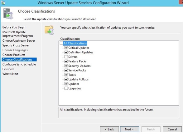 On the Classification Page, you need to specify the types of updates to be deployed via WSUS. It is recommended to select: Critical Updates, Definition Updates, Security Packs, Service Packs, Update Rollups, and Updates.