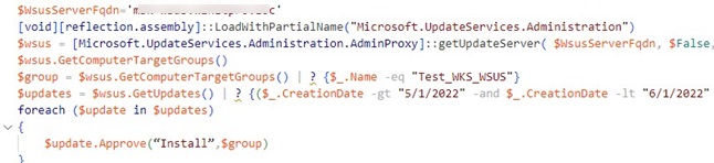 For example, you can use the following PowerShell script to approve the latest security updates for a target group: